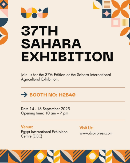 鄭州鼎盛機(jī)械有限公司,將于2025年9月14至16日在埃及國際展覽中心,第37屆撒哈拉國際農(nóng)業(yè)展覽會參展,和各國友人交流分享榨油機(jī)各種知識。